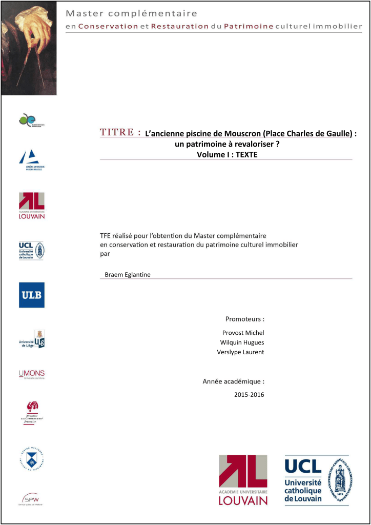 Eglantine Braem, de Luingne, master en archéologie et histoire de l’art UCL 2014, propose son travail de fin d’étude pour l’obtention du master complémentaire en conservation et restauration du patrimoine culturel immobilier sur « L’ancienne piscine de Mouscron (Place Charles de Gaulle) : un patrimoine à revaloriser ? » présenté au défunt Institut du Patrimoine Wallon à la fin de l’année académique 2015-2016 pour lequel elle a obtenu la plus grande distinction. La candidate a fait connaître cette recherche, notamment lors des visites organisées lors des « Journées Wallonie Bienvenue » 2017 (?), avec l’édition d’un dépliant, par la publication d’articles, dont celui dans notre revue Le Fil du temps n° 15-20 et d’autres encore en gestation, lors de sa conférence le 10 octobre 2017 à la tribune de la Société d’Histoire où étaient conviés les membres d’Hainaut Seniors, lors d’une présentation le 31 octobre à la Société des Guides de Mouscron. Elle continue à s’investir dans la promotion du patrimoine local.